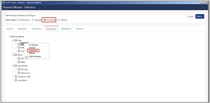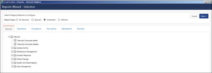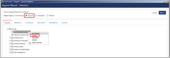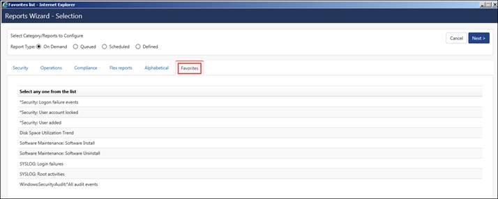 3 Select the required Security/Operations/Compliance/Flex Reports /Alphabetical/Favorites tab.